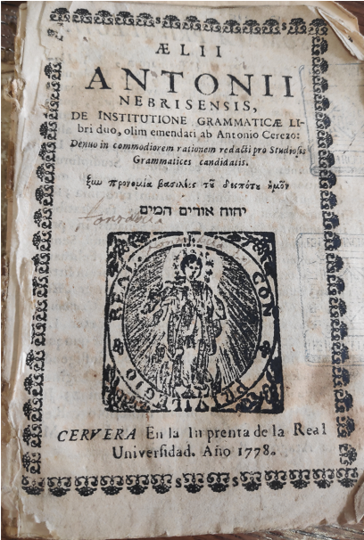 Exemplar de la Gramàtica de Nebrija amb una frase en grec i una altra en hebreu. C-195/8/32.