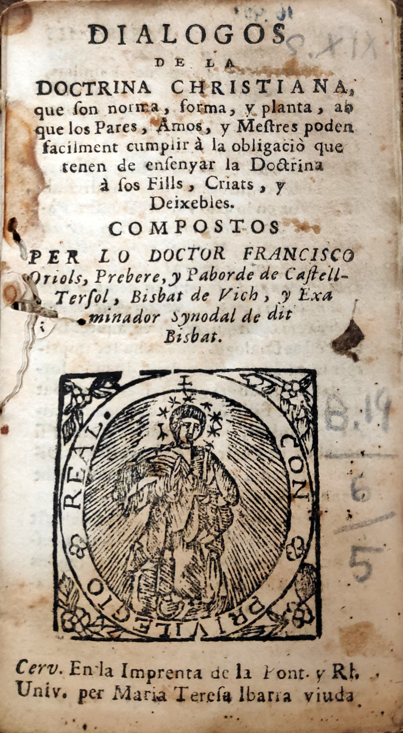 Exemplar de la Doctrina Christiana de Francesc Orriols suposadament impresa per Maria Teresa Ibarra. B-19/6/5.