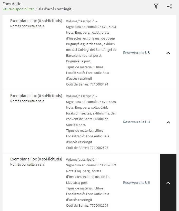 És important tenir en compte que, tant en el llistat de resultats com dins l’apartat “Aconseguir-lo” dels registres, no es mostren a primer cop d’ull les signatures topogràfiques, que es veuen amb les opcions de desplegament, acompanyades per les característiques dels exemplars. Aquesta decisió s’ha pres per afavorir la visibilitat de tots els volums i exemplars pertanyents a una edició, una circumstància que afecta gairebé la meitat del fons antic, i per potenciar el coneixement dels elements propis del llibre des d’un punt de vista material, de propietat i d’ús.